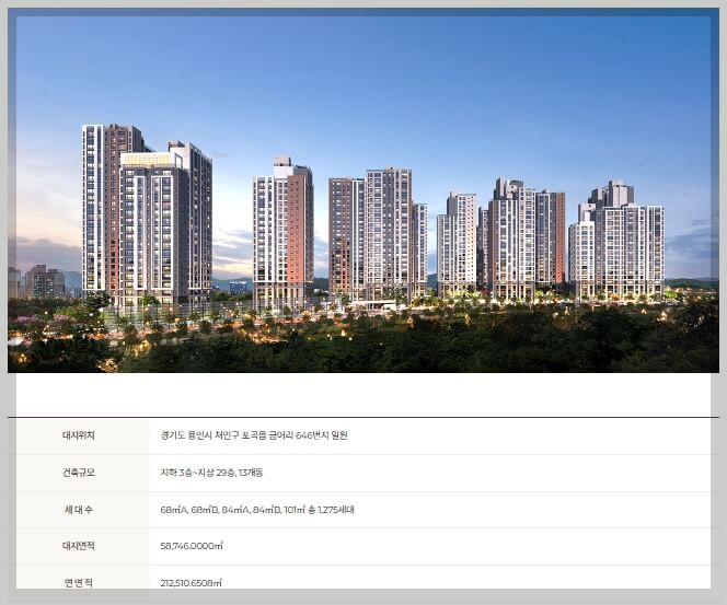 위치: 경기도 용인시 처인구 포곡읍 금어리 646번지 일원 건축규모: 지하3층 ~지상 29층 , 13개 동