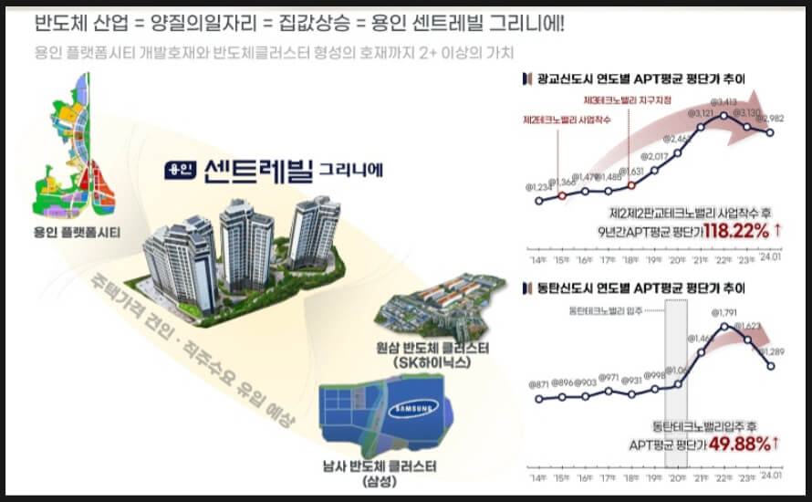 이 아파트는 GTX-A와 용인 플랫폼시티 개발의 수혜 지역에 위치하고 있어 미래에 대한 투자가치가 높습니다. 반도체 산업이 주변에서 활발히 진행되고 있어 일자리 창출과 집값 상승이 예상되며, 이는 용인 센트레빌 그리니에의 가치를 더욱 높여줄 것으로 전망됩니다.