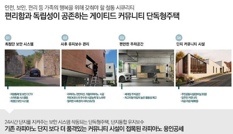 라피아노는 주거공간을 단순히 살 곳으로만 보지 않고, 주거와 함께 라이프스타일을 선택하는 공간으로 디자인되었습니다. 홈 오피스, 홈 카페, 홈 트레이닝 공간 등을 융합하여 다양한 생활양식을 수용하며, 주거환경을 통해 풍요로운 라이프스타일과 주거 시설물은 최첨단 보안시스템으로 안전성을 강화하였습니다. 게이트드 커뮤니티로 시스템적인 안전성을 높여주며, 입주민의 안전을 위해 철저한 관리와 유지보수가 이루어집니다.