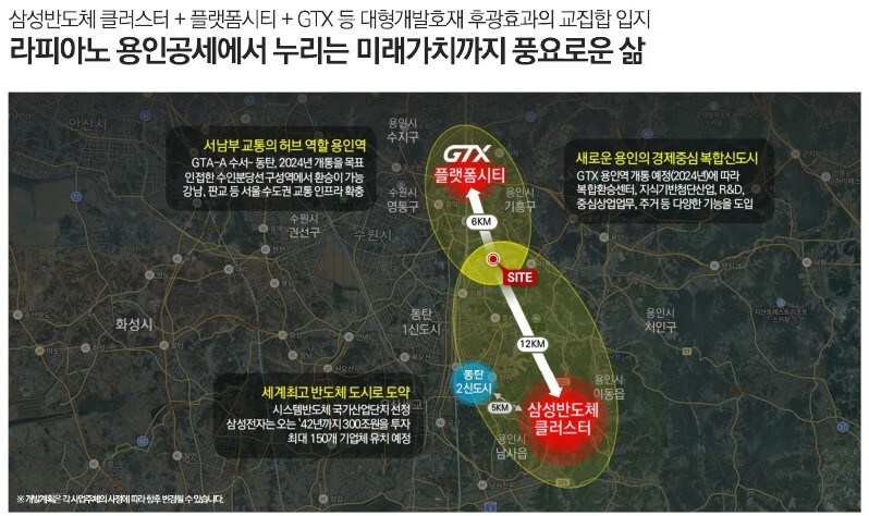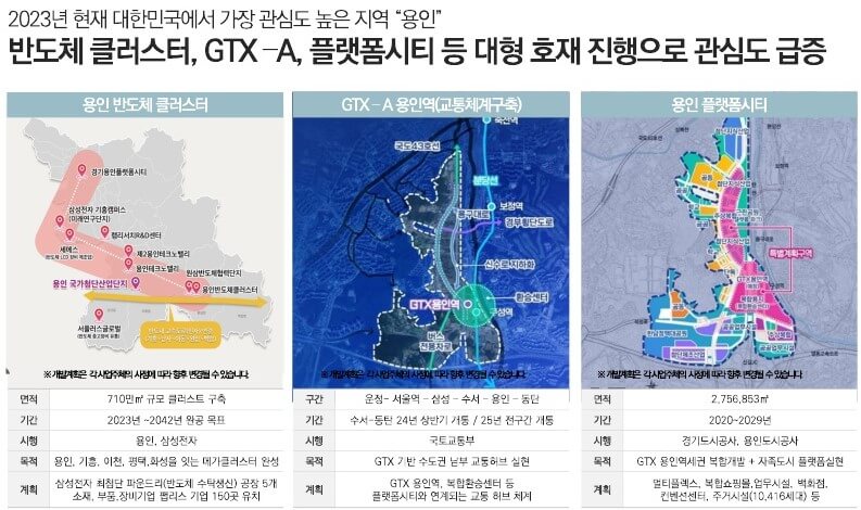 특히, GTX-A 용인역 개통 예정과 공세역 신설 가능성, 대기업 연구단지와 세계 최대규모 반도체 클러스터인 용인플랫폼시티 개발로 인한 직접적인 수혜가 기대됩니다. 반도체 벨트단지 접근성 수혜와 삼성, SK하이닉스 등의 세계 최대 반도체 클러스터 구축은 주거지의 발전 가능성을 높여줍니다.