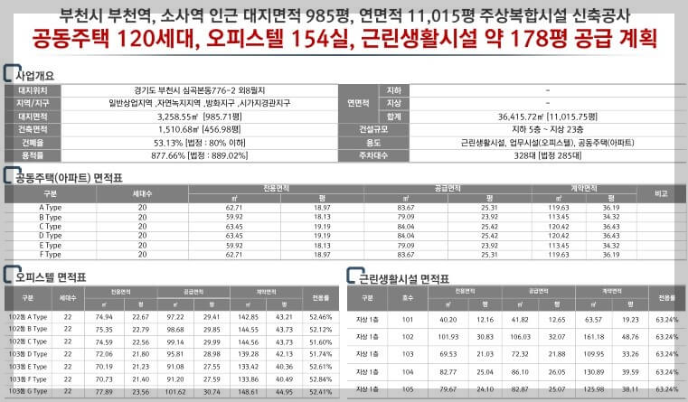 위치는 경기도 부천시 심곡본동 776-2 및 외 8필지에 있으며 일반상업지역, 자연녹지지역, 방화지구, 시가지경관지구로 지정되었습니다. 총 23층 중 지하 5층으로 건물 규모가 크며, 법정 용적률과 건폐율을 고려하여 개발되었습니다.