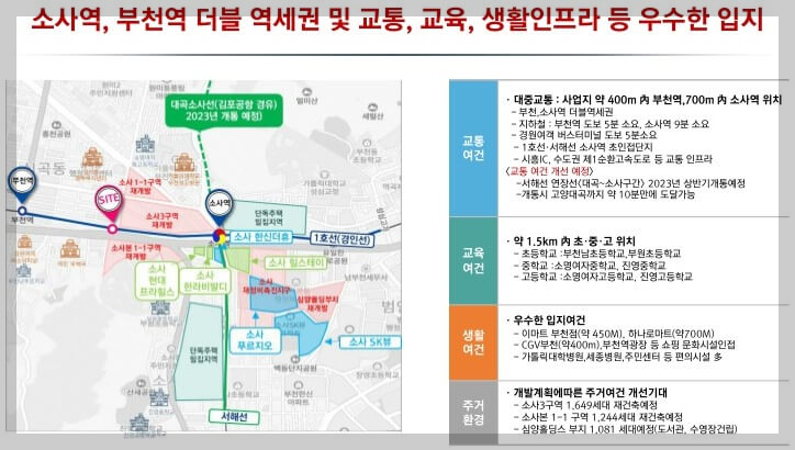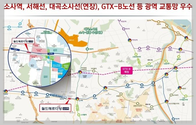 소사역, 서해선, 대곡소사선(연장), GTX-B노선 등 광역 교통망이 잘 구축되어 있어 교통 접근성이 뛰어납니다.