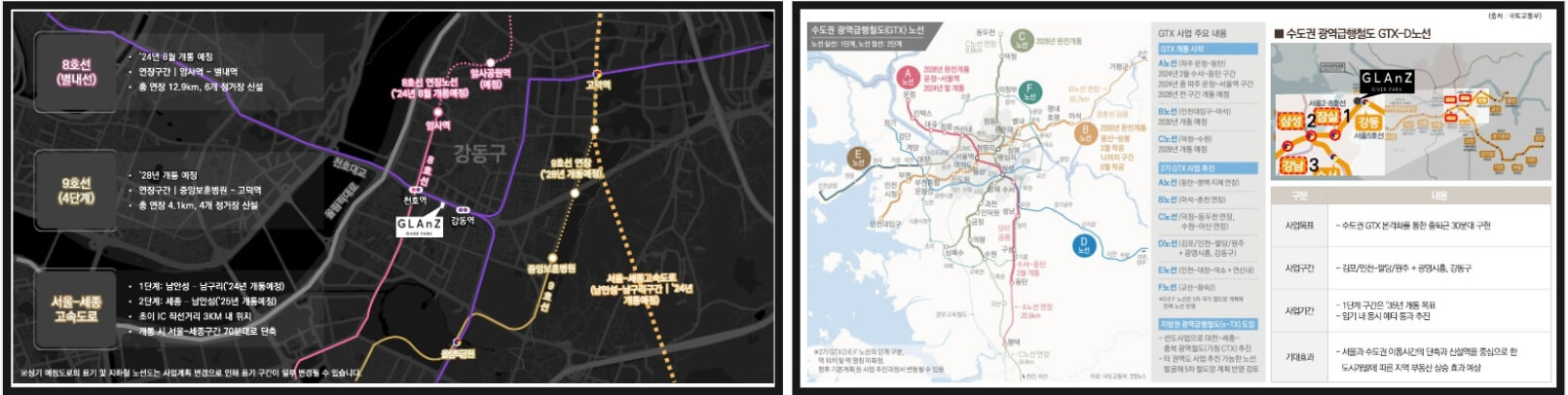 강동 그란츠 리버파크는 서울 지하철 5호선과 8호선 천호역 및 5호선 강동역 중간에 위치해 있어 더블 역세권의 혜택을 누릴 수 있습니다. 지하철을 통해 잠실(3정거장), 삼성(6정거장), 강남(9정거장) 등 주요 상업 및 업무 지역으로의 접근이 용이하여 직장인에게 최적화된 입지를 자랑합니다. 또한 천호대로, 올림픽대로, 서울-세종고속도로(예정) 등 초고속 교통망이 인접해 있어 차량 이동도 편리합니다.