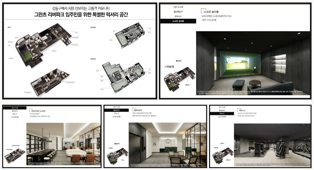 강동 그란츠 리버파크는 단지 내에 프리미엄 사우나, 피트니스 센터, 스크린 골프 시설을 갖추고 있어 입주민에게 품격 있는 여가 생활을 제공합니다. 이러한 시설은 시행사 DH그룹이 직접 운영하여 높은 수준의 서비스를 보장하며, 입주민을 위한 SLP 비서 서비스, 조식 서비스, 발렛 주차 서비스 등 럭셔리한 커뮤니티 서비스를 제공합니다. 특히, 조식 서비스는 신세계푸드가 맡아 매일 다양한 고급 식단을 제공합니다.