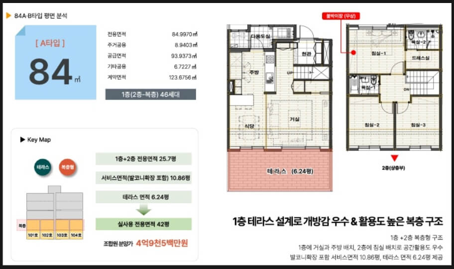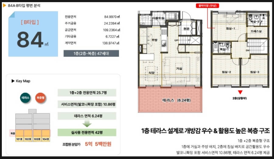 복층 설계로 1+2층 면적 약 26평, 서비스 면적 10.86평, 테라스 면적 6.24평, 실사용 면적 42평.