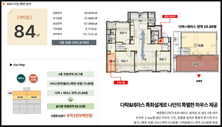 평면 구조에 옥탑 다락 포함. 전용 25.7평, 서비스 면적 10.86평, 다락 및 테라스 면적 25.96평, 실사용 면적 62.52평.
