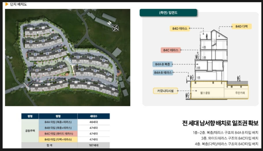 세종 더 테라스는 세종시 장군면에 위치한 지하 1층~지상 4층, 총 9개 동, 187세대 규모의 고급 테라스 아파트입니다. 정부청사와 차량으로 약 15분 거리로 출퇴근이 용이하며, 서울 세종 고속도로 개통 시 서울까지 1시간대 이동이 가능하여 교통 여건이 매우 우수합니다. 세종 더 테라스 타운하우스는 합리적인 분양가, 우수한 입지, 쾌적한 자연환경, 풍부한 생활 인프라를 갖춘 주거 공간입니다. 복층 설계와 테라스, 누다락 등 공간 활용도를 높인 구조와 함께 파격적인 분양 조건은 투자와 실거주 모두를 고려한 최적의 선택이 될 것입니다.