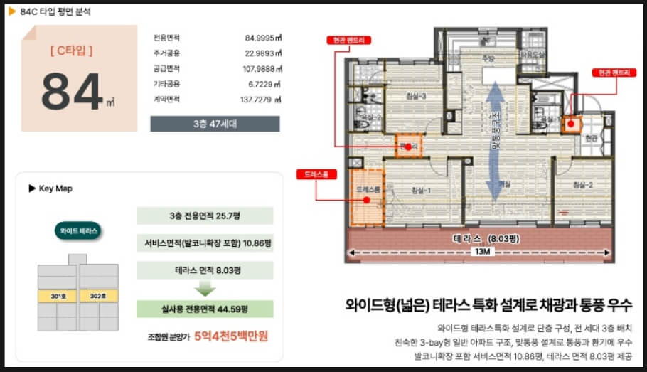 세종 더 테라스는 전 세대가 84㎡로, 가장 인기 있는 국민평형대로 구성되어 있습니다. 또한, A, B, C, D 총 4가지 타입으로 다양한 선택지를 제공합니다.