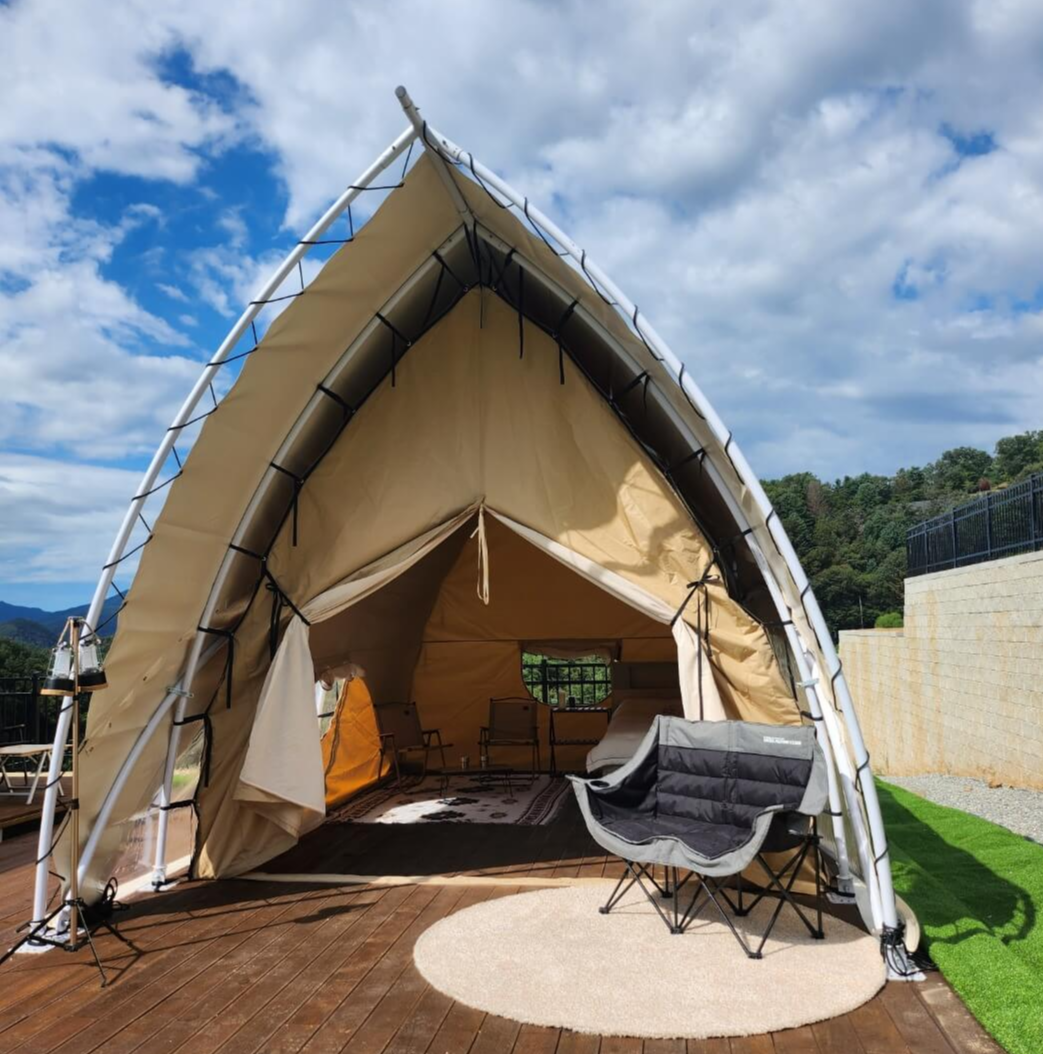 고급 글램핑 텐트와 캠핑 시설: 글램핑용 다목적 텐트와 데크, 최고급 그릴, 파라솔 패키지 등 고급스러운 캠핑을 위한 모든 준비가 완료되어 있습니다.