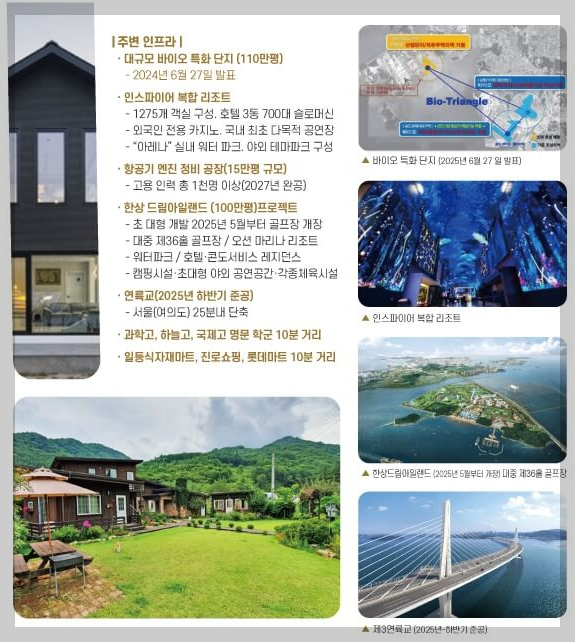 영종도는 향후 5년 내 다양한 개발 호재가 예정되어 있어 지역 경제와 부동산 시장에 긍정적인 영향을 미칠 것으로 예상됩니다. 2025년에는 한상드림아일랜드와 제3연륙교가 완공될 예정이며, 110만 평 규모의 바이오 특화 단지가 조성되어 지역 경제에 큰 기여를 할 전망입니다. 특히, 한상드림아일랜드 프로젝트는 초대형 관광 개발 프로젝트로, 골프장, 오션 마리나 리조트, 워터파크, 호텔 및 콘도 서비스 등 다양한 시설이 들어설 예정입니다. 이로 인해 관광객 유입이 증가하면서 지역의 경제 활성화와 더불어 부동산 가치 상승에도 기여할 것입니다.