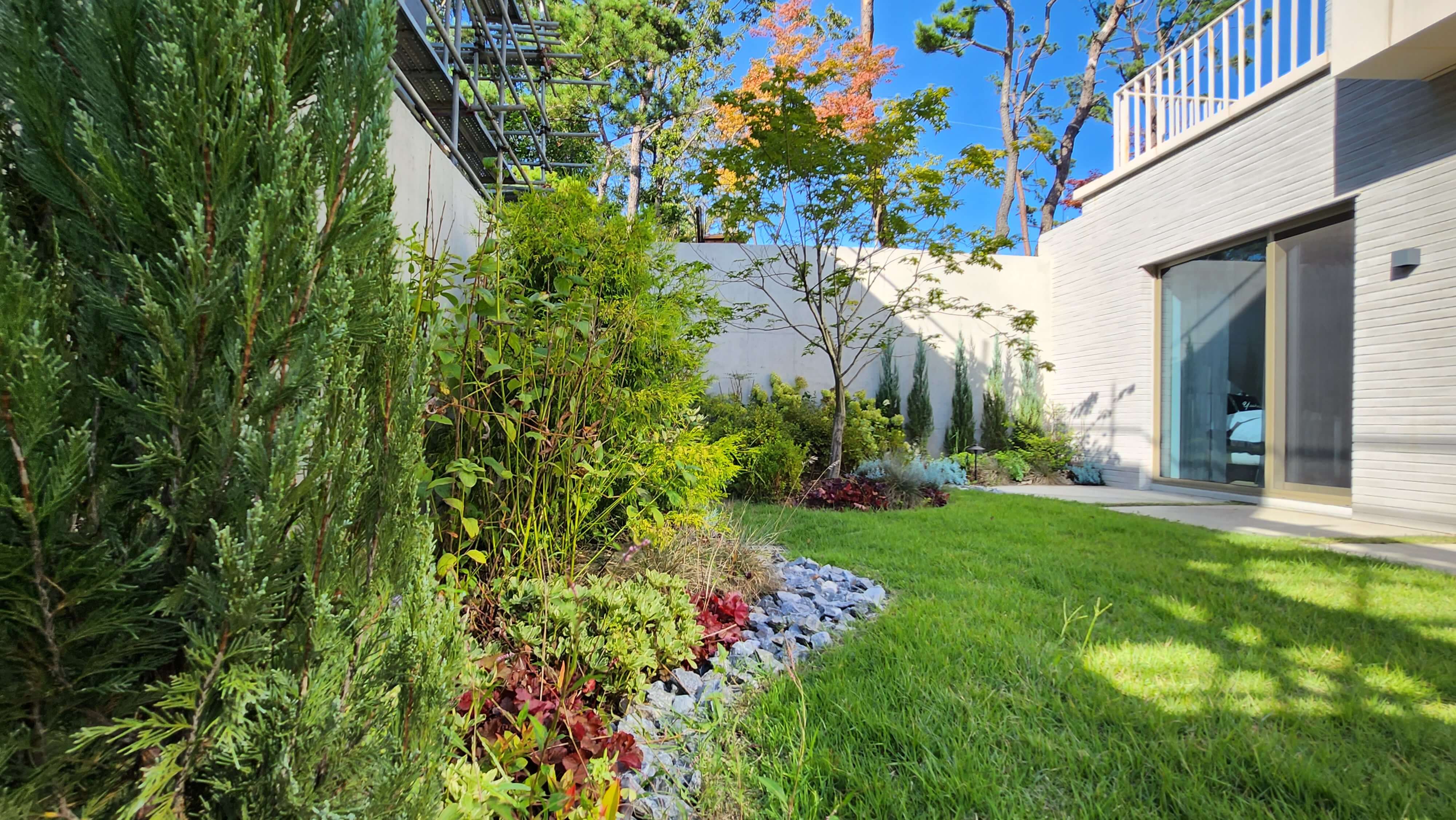 파고라 지붕이 있는 테라스 공간은 고급스러우며, 마당 정원은 담장으로 둘러싸여 안락한 생활을 즐길 수 있습니다. 정원 조경디자인은 도시공학 박사인 최재현 교수가 직접 디자인하여 풍요로운 녹지환경을 조성했습니다.