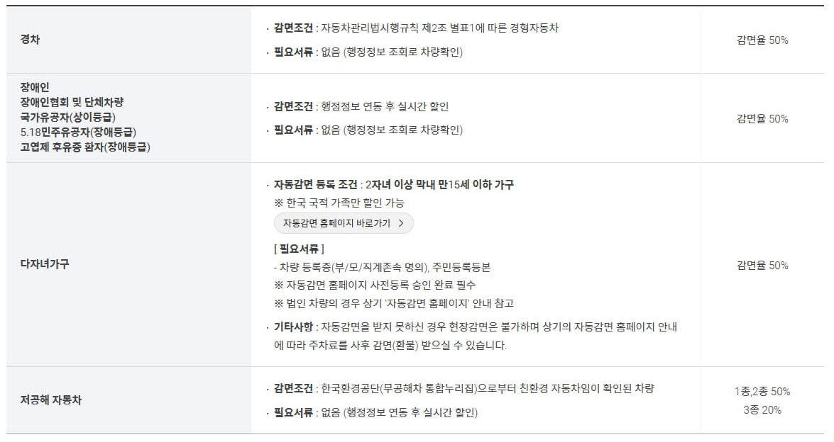 자동감면받지 못한 경우 각각의 감면사유에 해당하는 서류를 출차 후 30일 이내에 사후환불 신청 홈페이 지을 출차 영수증번호와 함께 제출하시면 출차기록과 대조하여 감면해 드립니다.