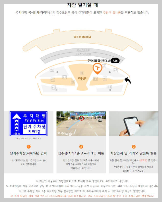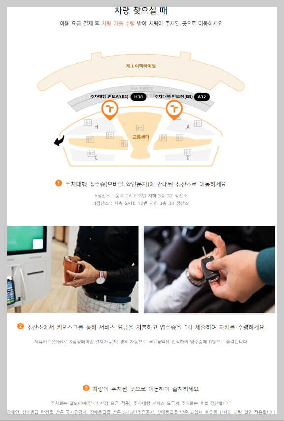 . 주차대행 접수증에 안내된 출차장소로 이동 후 서비스요금을 지불하고 차량을 인도받으시면 됩니다.
