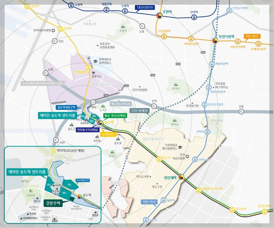 래미안 송도역 센트리폴은 송도역과 인접해 있어 교통 인프라의 혜택을 누릴 수 있는 최적의 입지입니다. 현재 수인분당선을 이용할 수 있는 송도역은 인천부산을 잇는 인천발 KTX와 송도강릉 경강선의 개통이 예정되어 있어 광역 교통망이 대폭 확충될 예정입니다. 특히, 월곶에서 성남 판교까지 수도권 남부를 동서로 연결하는 월판선의 개통은 송도역의 교통 접근성을 한층 더 높일 것입니다. 월판선은 시흥 월곶역에서 송도역을 거쳐 판교까지 연결되며, 송도에서 수도권 주요 지역으로의 이동이 더욱 편리해질 것입니다. 단지는 제2경인고속도로와도 가깝게 위치해 있어 차량을 이용한 이동 역시 편리합니다. 이러한 교통 호재들은 송도역 일대를 인천의 새로운 교통 중심지로 탈바꿈시킬 것으로 기대됩니다.