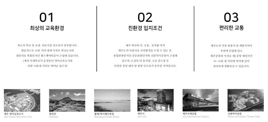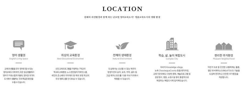 제주도의 각종 관광지 및 개발지역이 주변에 인접해 있고 제주공항과 서귀포 제2공항 예정지가 30~40분 내 거리에 위치해 있어 편리하게 생활하실 수 있습니다. 천혜의 자연환경과 함께 하는 글로벌 영어교육도시!! 명품교육도시의 생활환경 영어 생활권, 모두 영어로 할 수 있는 영어교육도시에 위치, 모든 일상생활에서 영어가 자유스럽게 이용되, 영어권 국가의 도시에서 생활하는 것과 같은 환경을 누릴 수 있습니다.