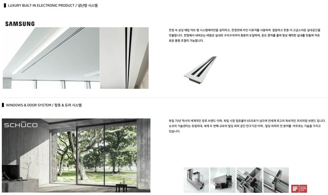 빌라드 드므는 각 세대마다 5대의 주차공간을 제공하며, 24시간 보안과 주택관리 서비스를 강화하여 안전한 환경을 제공합니다. 태양열, 전기차 충전기, 전열교환기 등 친환경 시스템을 도입하여 자연 친화적인 주거문화를 실현하였습니다. 내부 공간은 현관, 거실, 주방, 침실 3개, 욕실 3개, 게스트화장실, 세탁실 등이 갖춰져 있으며, 라운지, 침실, 드레스룸, 욕실이 있는 2층에는 루프탑에는 수영장이 설치되어 힐링 공간을 제공합니다.
