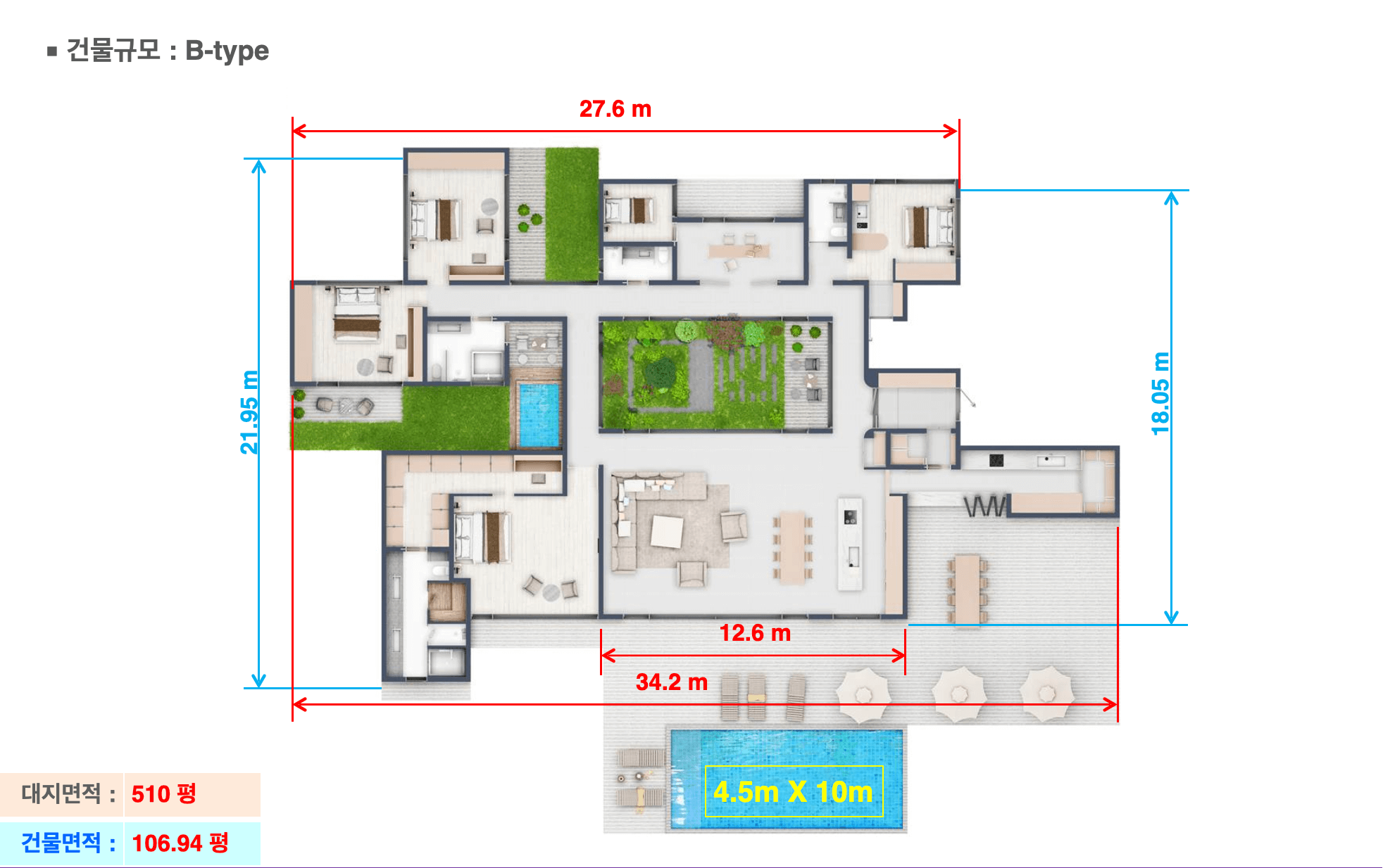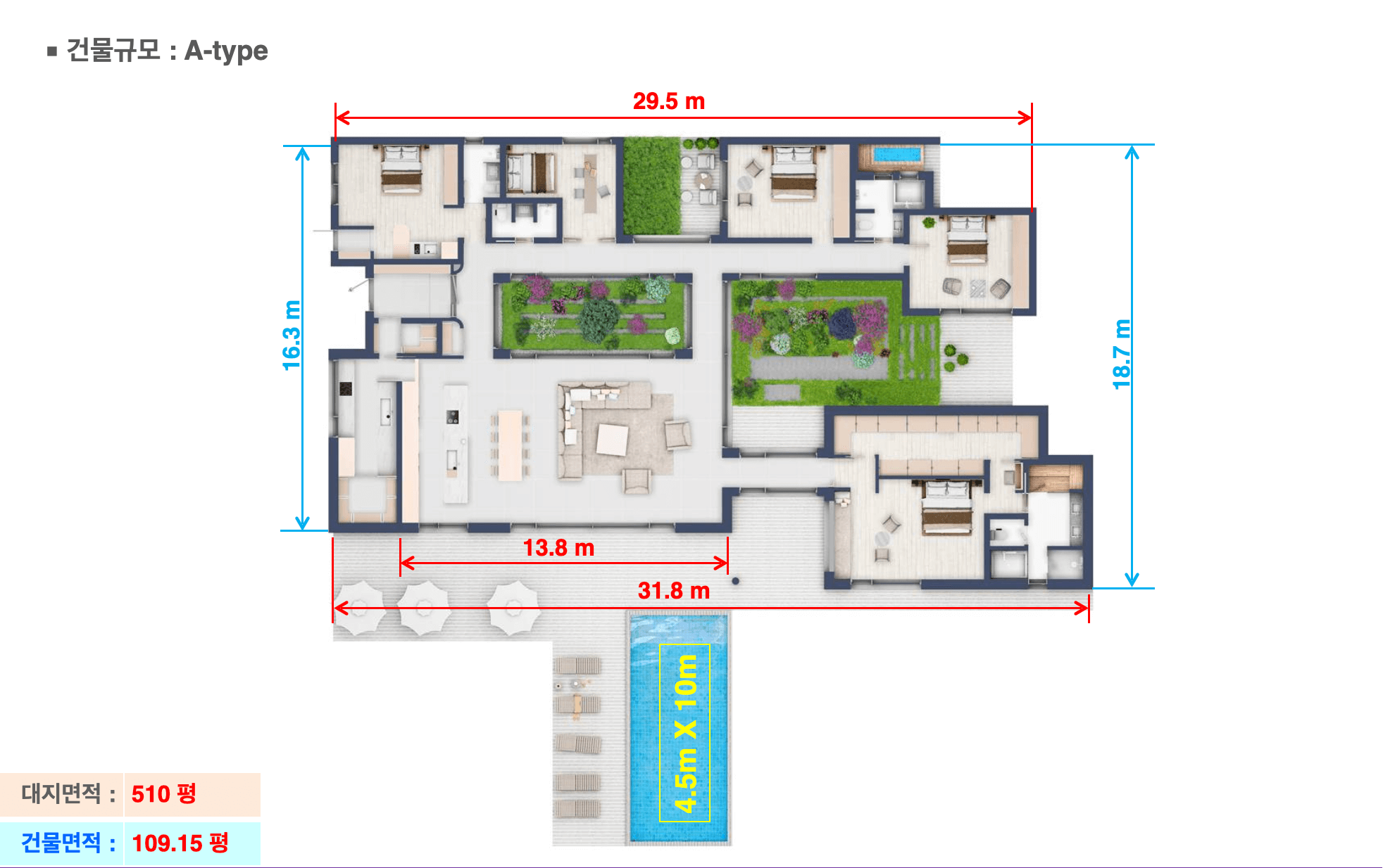 추가로 다실, 레슨실, 취미실 등 다양한 활용이 가능한 공간과 4.5m x 10m 규모의 와이드 수영장을 제공합니다.