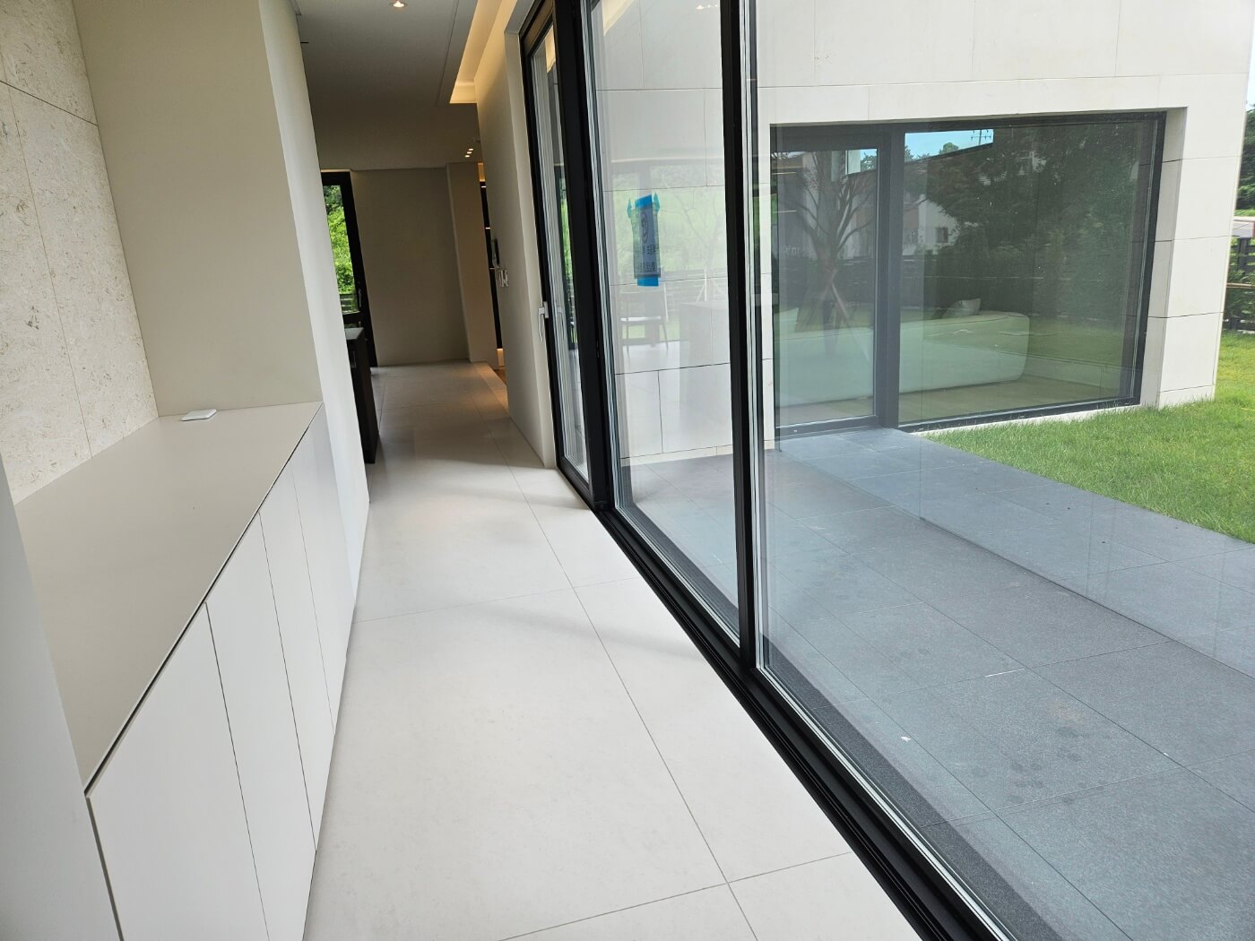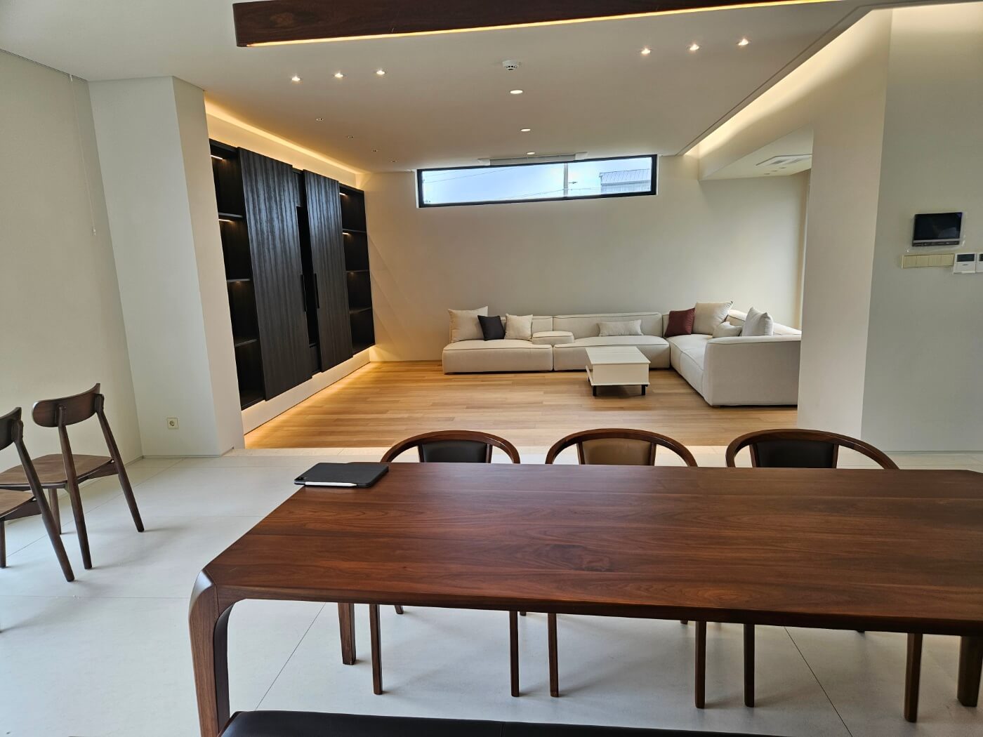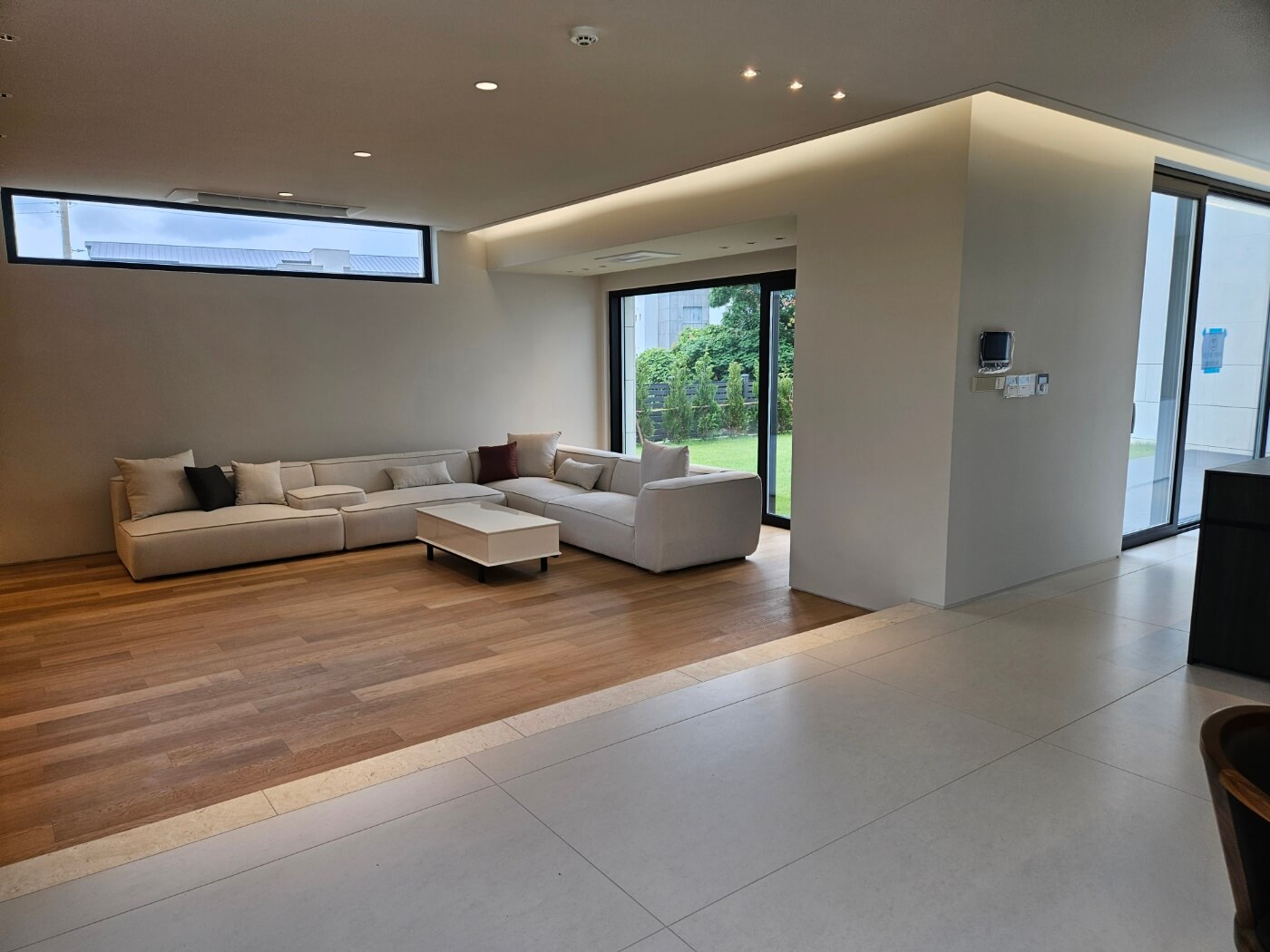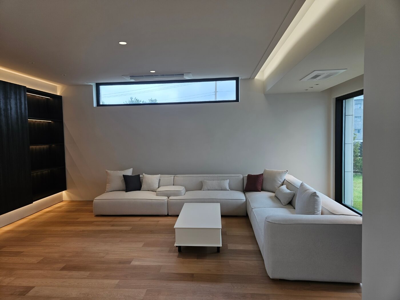 거실은 고급 원목마루와 독일 베카 시스템 창호를 사용하여 단열성과 기밀성을 높였으며, 높은 천고와 통창 설계로 채광과 개방감을 극대화했습니다. 정원과 연결된 공간으로 여유로운 생활이 가능합니다.