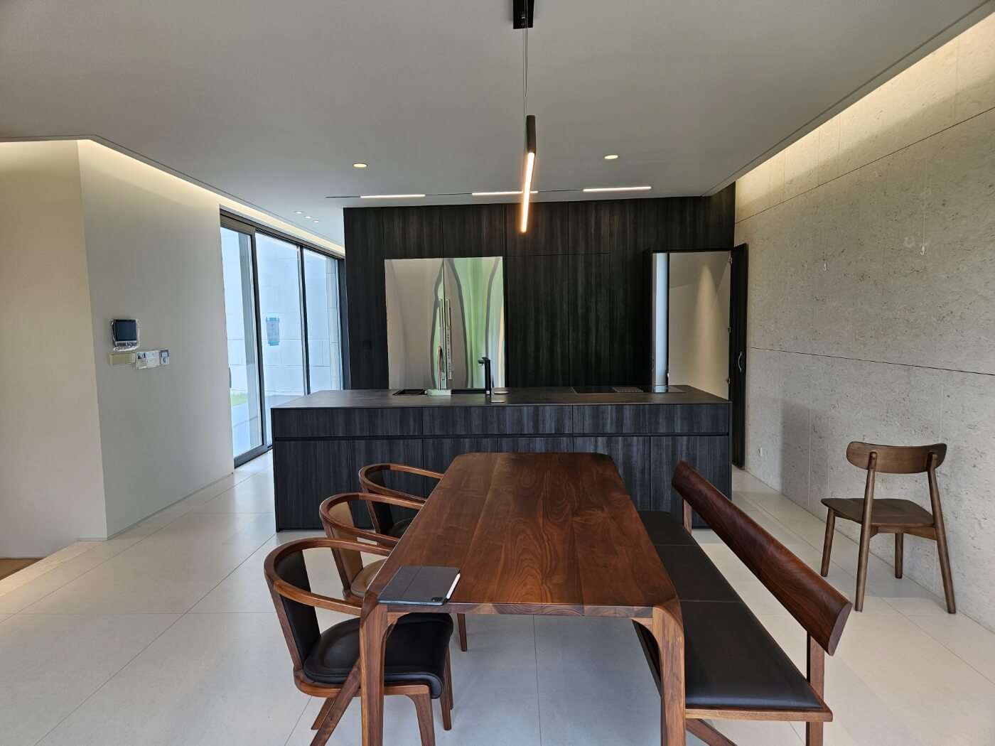 - 거실: 후면 통창, 픽스창 설계, 3m 높은 천고로 개방감과 채광 극대화