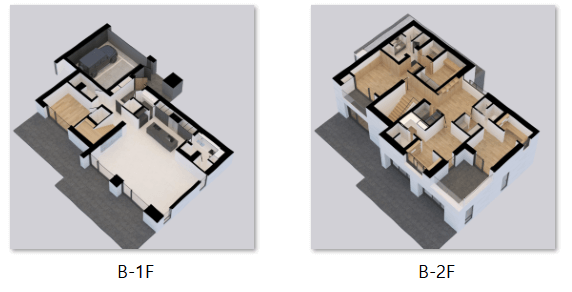 - 1층: 거실, 주방, 팬트리, 보조주방, 정원