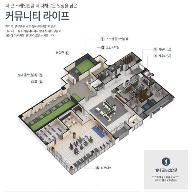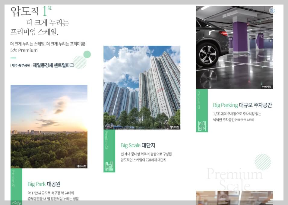 제일건설은 이미 제주의 랜드마크로 자리매김한 브랜드로서, 주차 공간은 제주에서 부족한 부분 중 하나였는데, 이번 프로젝트에서는 총 1,331대의 주차 공간을 확보하여 주거민의 편의성을 높였습니다. 또한, 대형 커뮤니티 시설인 피트니스, 사우나, 골프연습장 등이 다양하게 갖춰져 있으며, 주변에는 중부공원 속 다양한 문화공간도 가까운 거리에 위치하고 있다.