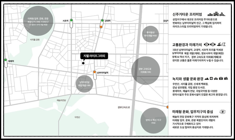 - 경부고속도로 지하화 - 지하화가 완료되면 녹지 공간과 문화복합시설이 조성되어 주거 환경이 대폭 개선될 예정입니다.