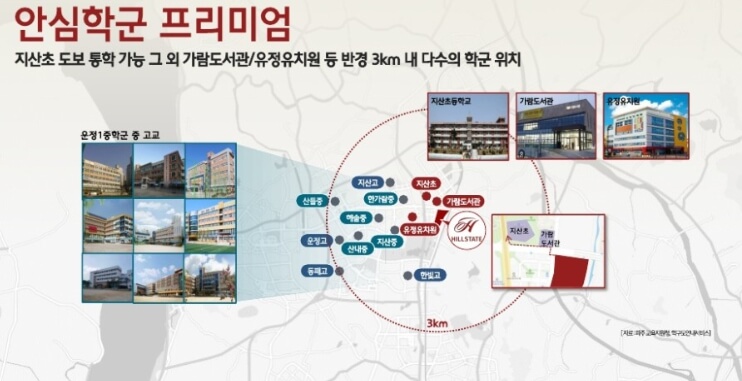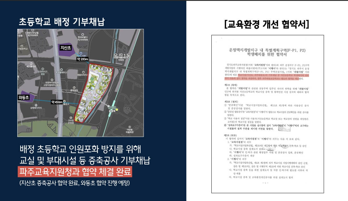 유정유치원, 파주 와동초, 지산초, 한가람 중 등 유치원과 초. 중. 고 모두 가까운 교육환경