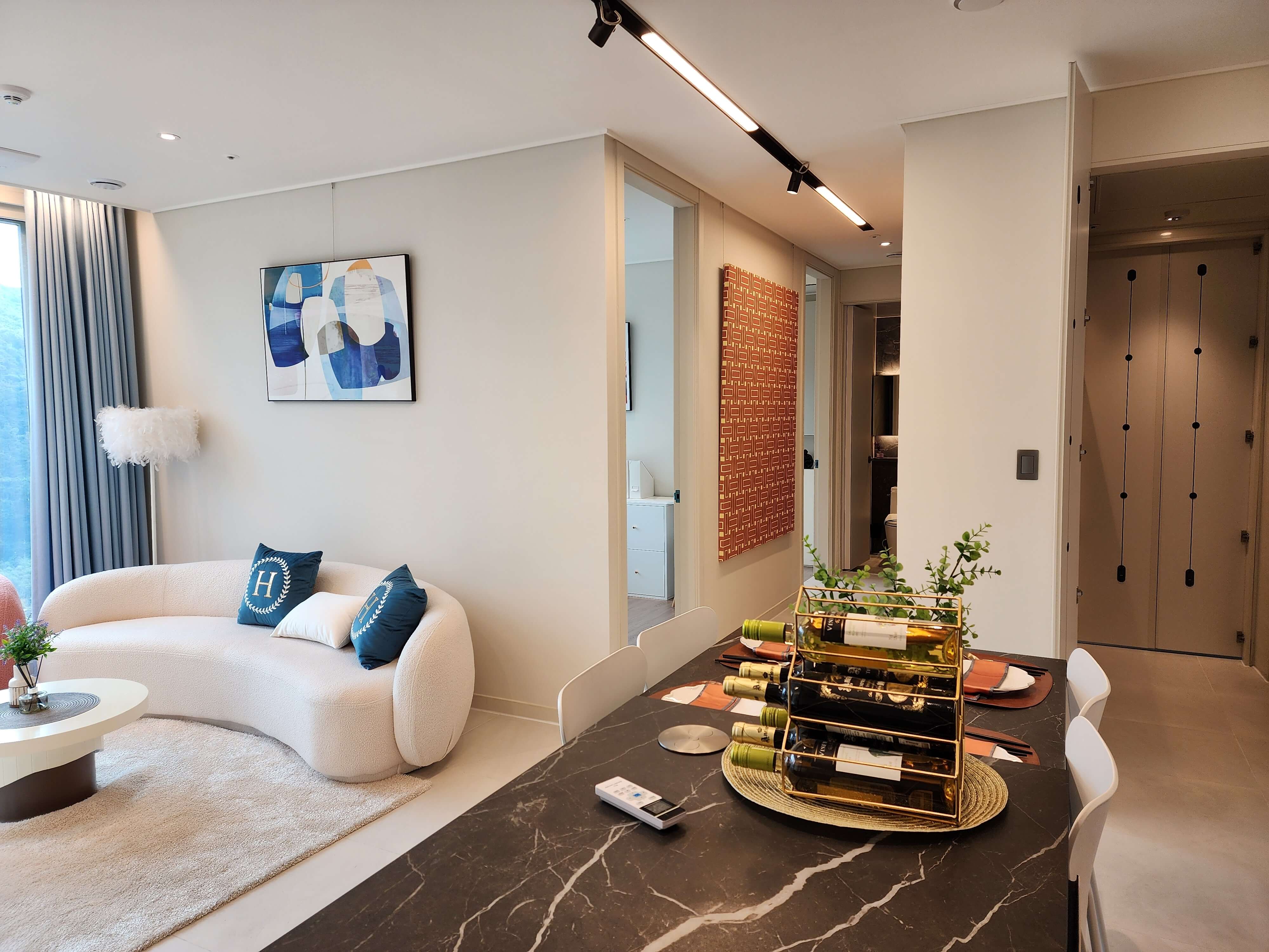- 84A1 타입은 현관, 주방, 다이닝이 일직선으로 연결되어 가사 동선이 효율적이며, 드레스룸과 팬트리, 붙박이장 등 다양한 수납공간을 확보했습니다.