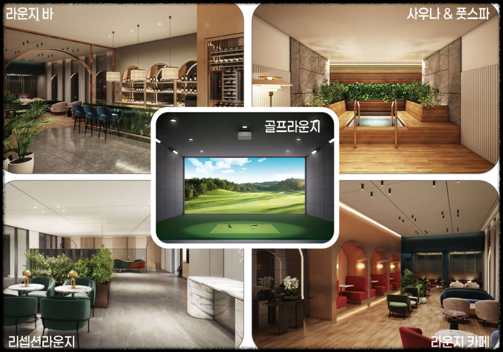 하이엔드급 커뮤니티 시설에는 스크린 골프, GDR 골프 연습장, 풋스파, 건식 사우나, 스마트팜이 마련돼 헬스케어와 힐링을 동시에 제공합니다. 또한 리셉션 라운지, 프라이빗 다이닝, 카페와 바를 통해 이웃 간 소통과 커뮤니티 활동도 지원합니다.