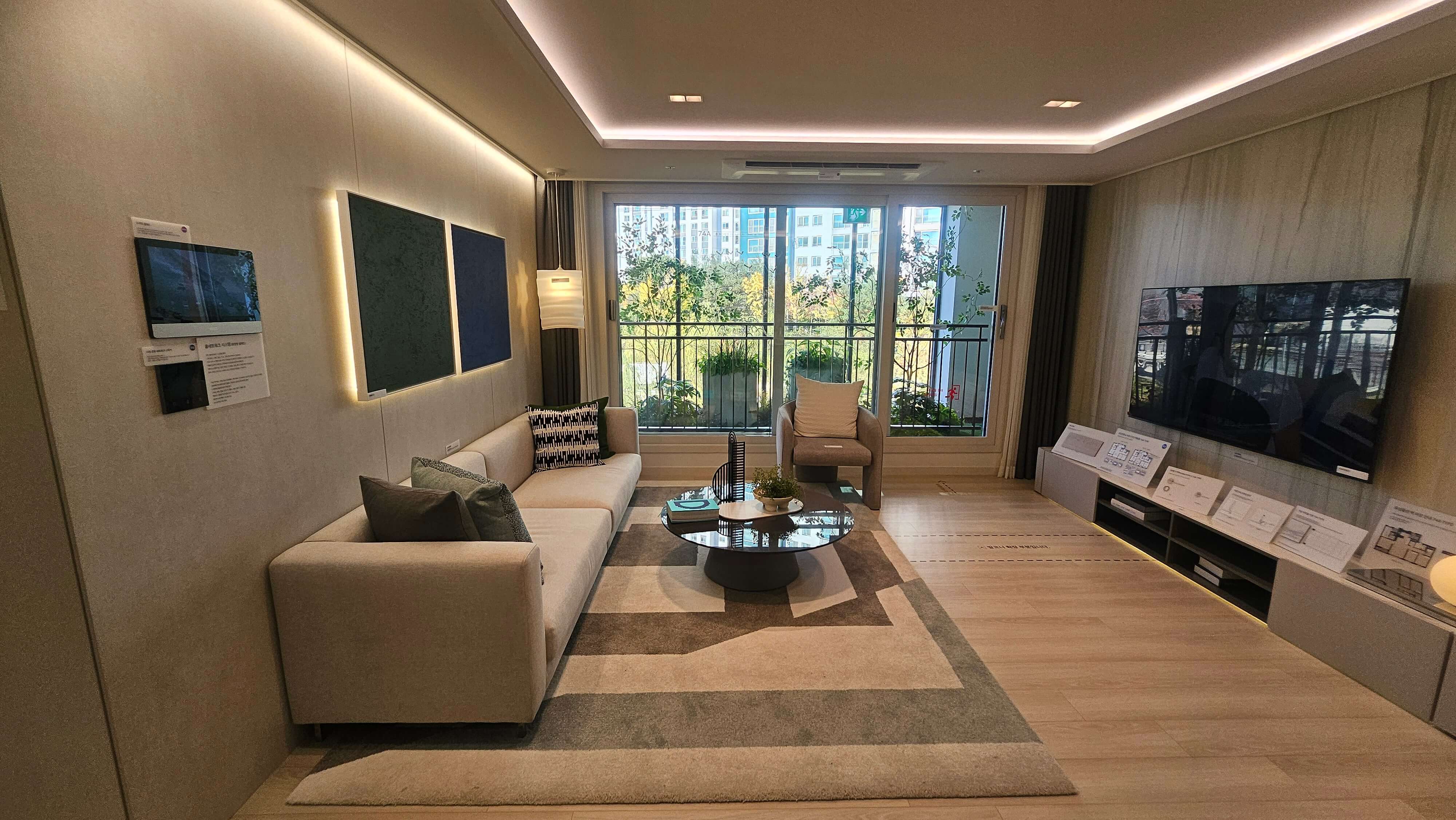 전용 59~84㎡의 중소형 평형 중심 구성은 실수요자의 라이프스타일을 고려한 설계입니다. 광폭 강마루, 세라믹 아트월, 간접조명 등 고급 마감재를 적용하여 실내 품격을 높였습니다.